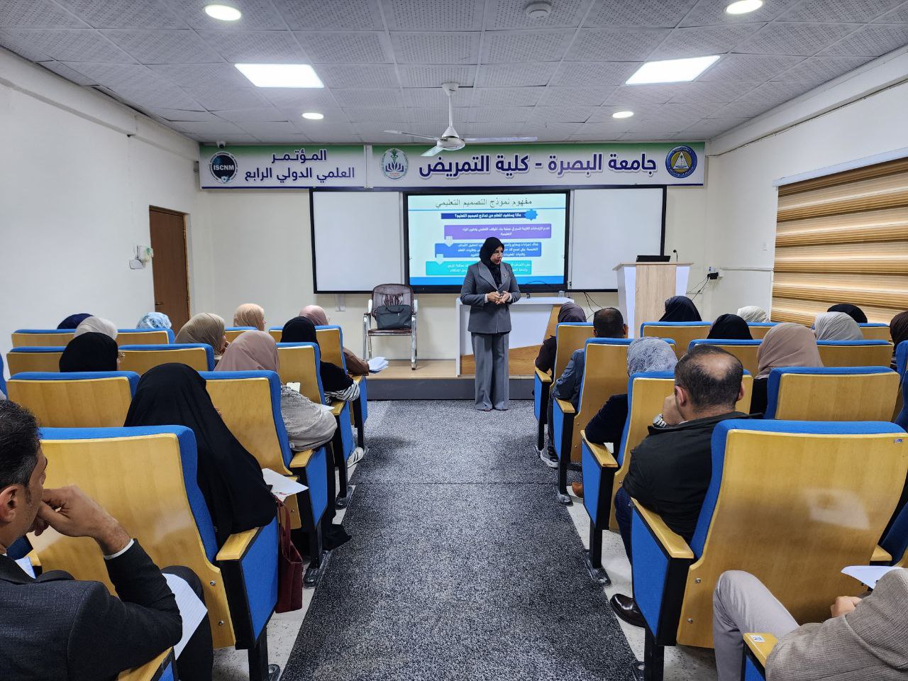 The lecture, presented by Dr. Zainab Ali Khalaf, included a presentation covering the title, objectives, content, target audience, teaching aids, a short video clip to capture the trainees' attention, the scientific content, implicit activities, conclusions, a summary, resources, and end-of-unit tasks.