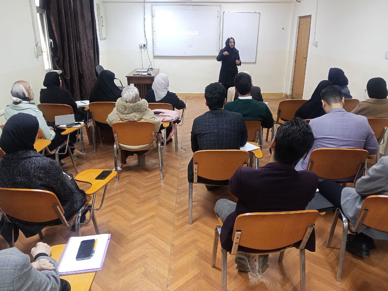 The lecture was delivered by Dr. Baha’a Shubram Ghadheeb and Dr. Zainab Falih Salim. It addressed the role of instructional design models as supportive tools in the educational process, through which appropriate methods for teaching instructional content are identified. Among the most widely used instructional design models highlighted was the ADDIE model, which is distinguished by several features, including ease of use, applicability to various types of education and training, time, effort, and cost efficiency, as well as flexibility for modification. Moreover, it is particularly suitable for novice teachers and trainers.