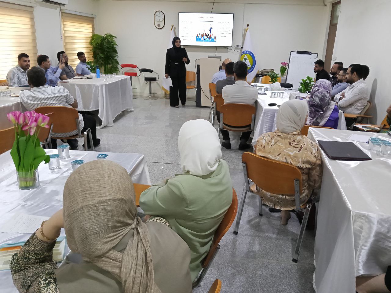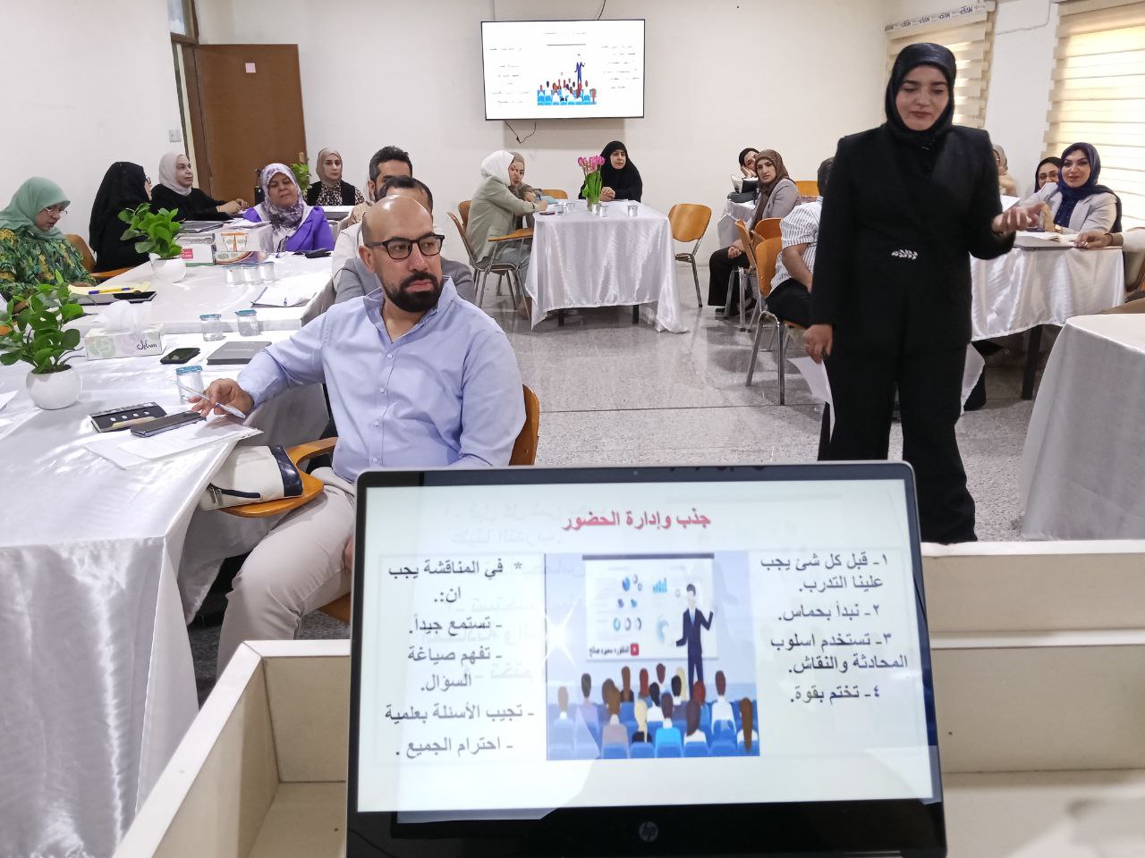 Delivered by Dr. Khadija Sami Madi and Dr. Mais Basil Jalil, the session covered the concept of the online lecture, mechanisms for creating digital content, and the steps for preparing an effective PowerPoint (PPT) presentation.