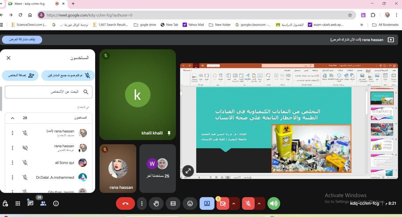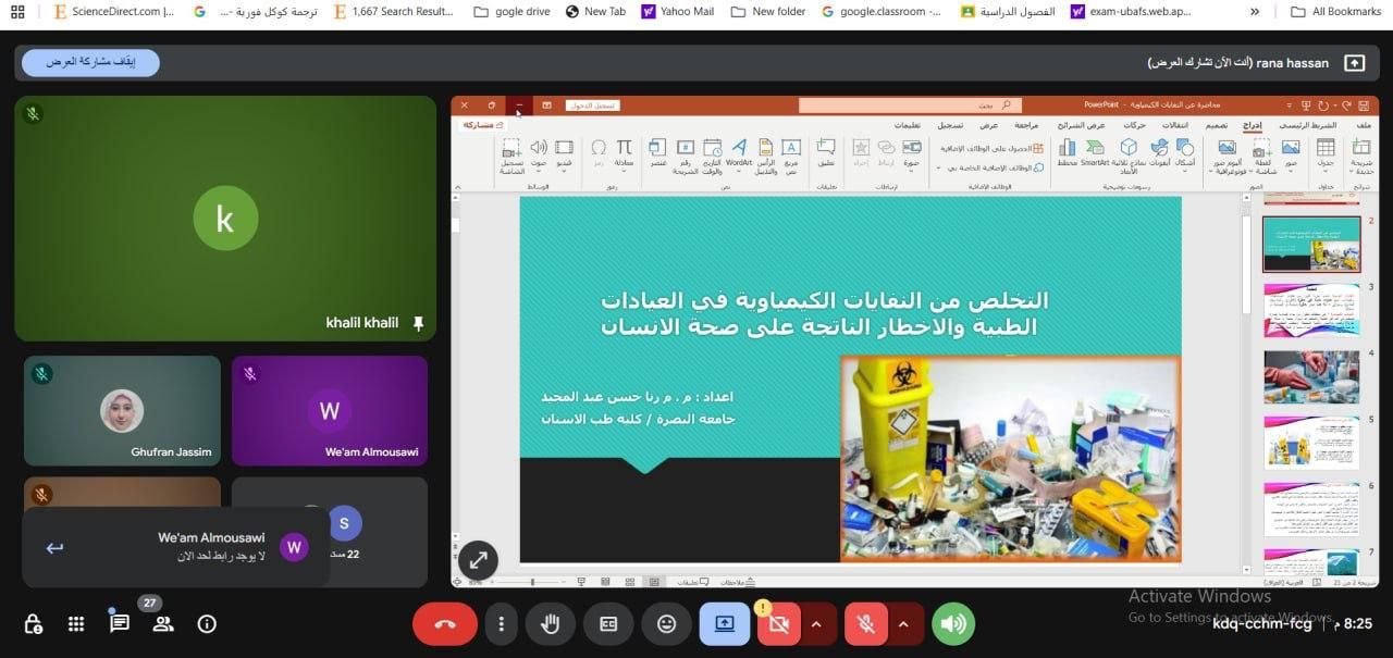 The Center for Continuing Education at the University of Basrah organized an online workshop titled “Disposal of Chemical Waste in Medical Clinics and Its Health Risks.”