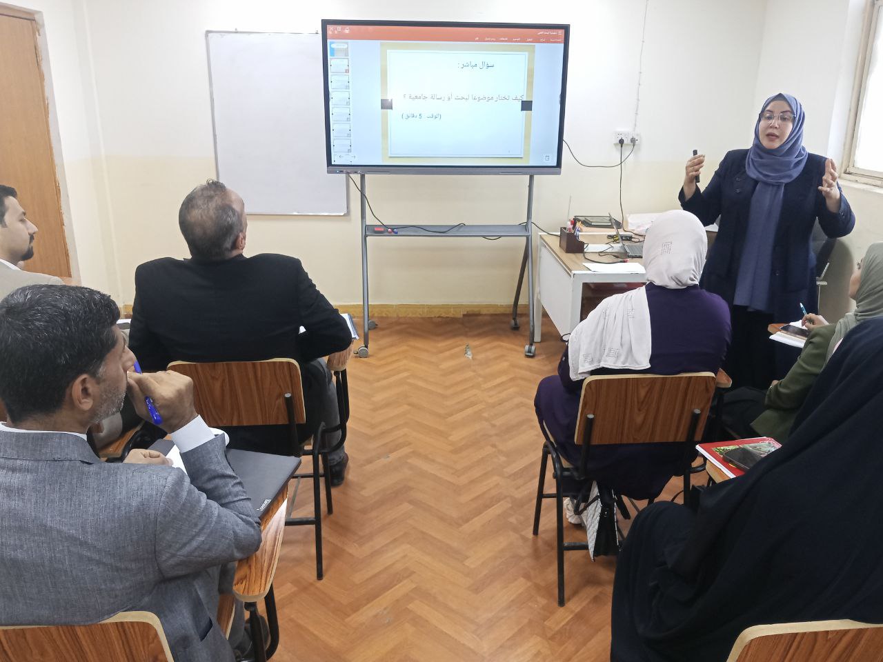 The Center for Development and Continuing Education at the University of Basrah organized a lecture on Scientific Research Methodology as part of Module Eight of the Fifth Teaching Methods Course, within the Humanitarian Specialization, according to the updated curriculum for the Southern Region. The lecture aimed to explain the correct scientific standards for organizing and conducting research and to introduce the methodology and steps of writing a scientific research paper.