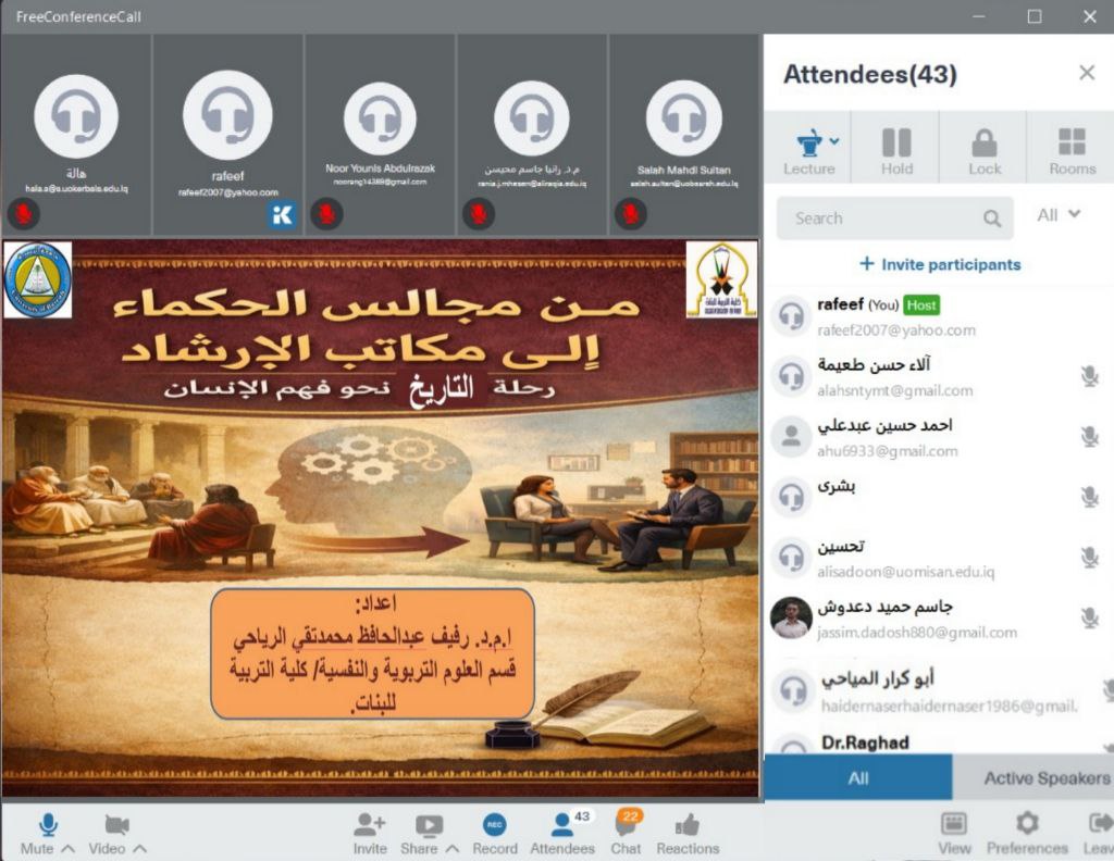 The Center for Development and Continuing Education at the University of Basrah, in cooperation with the College of Education for Women, held an online workshop entitled "From Councils of Wise Men to Guidance Offices: A Journey Through History Towards Humanity."