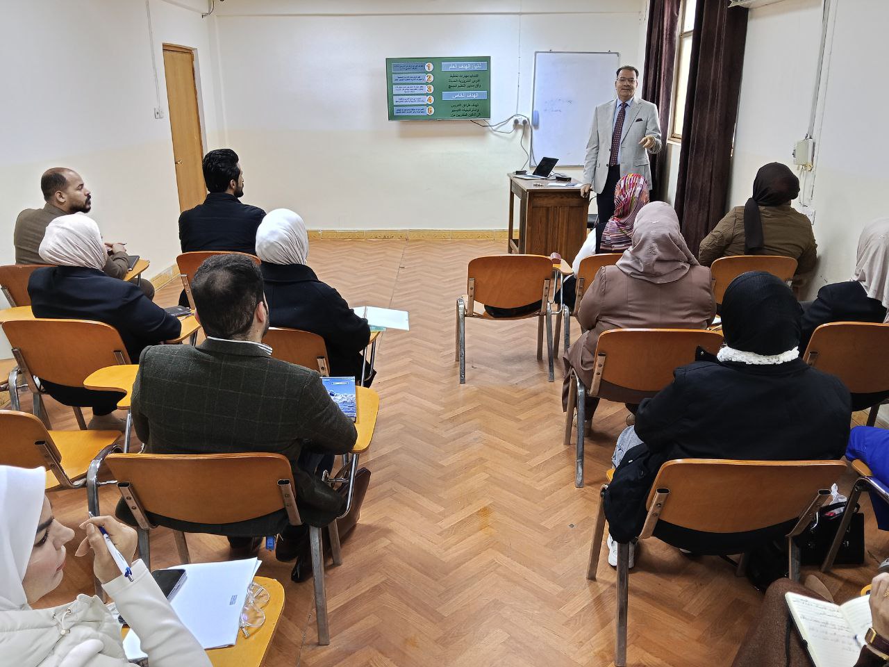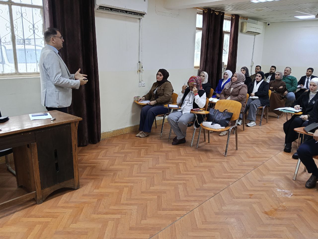 The lecture, delivered by Dr. Munaf Abdul-Kadhim Mohammed, included an explanation of the differences between strategy, approach, and method, as well as a review of modern teaching methods and tools supporting both in-person and online facilitation skills. It also addressed lesson management and approaches to handling training-related challenges