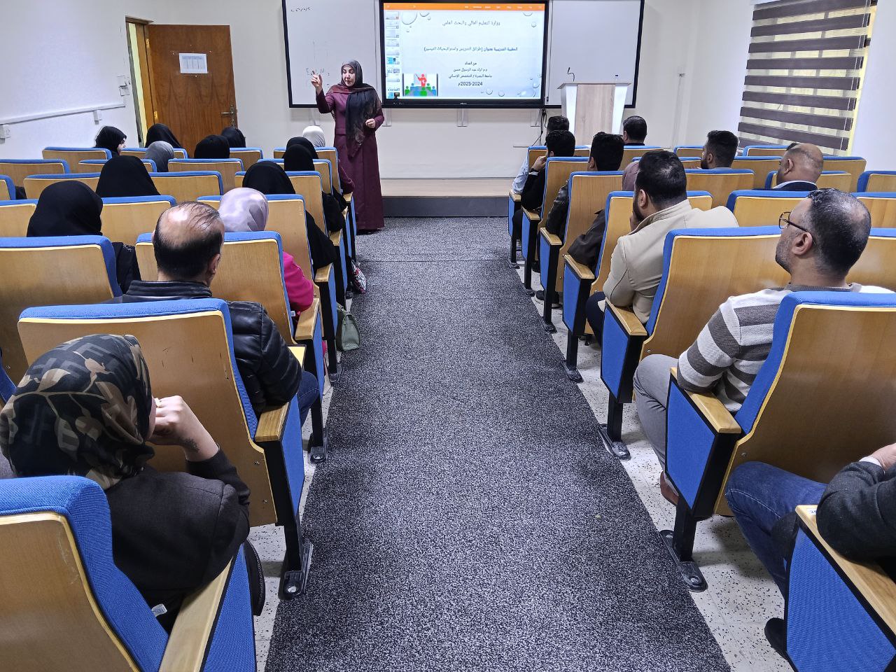 The lecture, presented by faculty member Tharaa Abdul-Rasoul Hassan, included an explanation of the general and specific objectives, the concept of strategy and its types, and a review of several practical examples, particularly the brainstorming strategy, which contributes to developing modern teaching skills among trainees