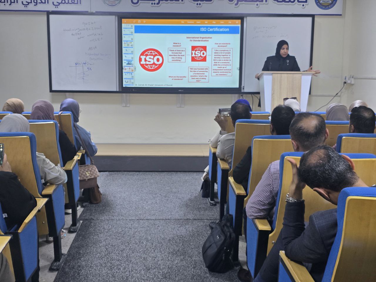 The lecture, presented by Dr. Zainab Ali Khalaf, included a detailed explanation of the components of quality and a demonstration of the Deming SWOT analysis.