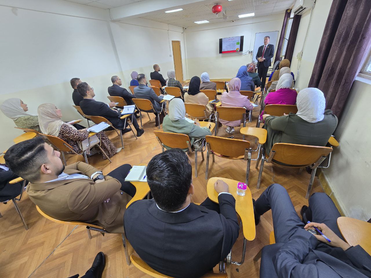 The lecture, delivered by Dr. Manaf Abdul-Kadhim Mohammed and lecturer Marwa Mousa Atwan, addressed a general overview of the concept of scientific research, the personal and organizational motivations for conducting research, the objectives of scientific research, the role of the research supervisor, and the main characteristics of scientific inquiry.