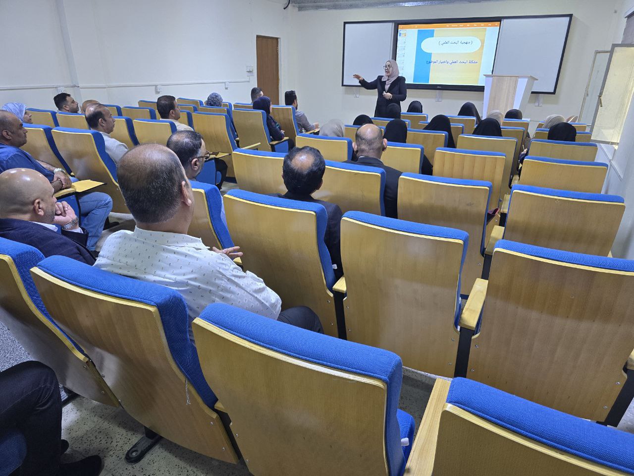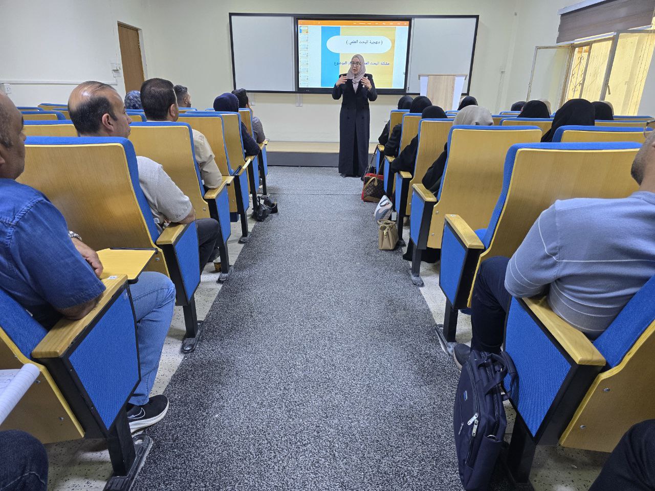 The lecture, delivered by lecturer Tharaa Abdulrasool Hassan, addressed the concept of scientific research, types of research methodologies, scientific research standards, and the stages of research writing.