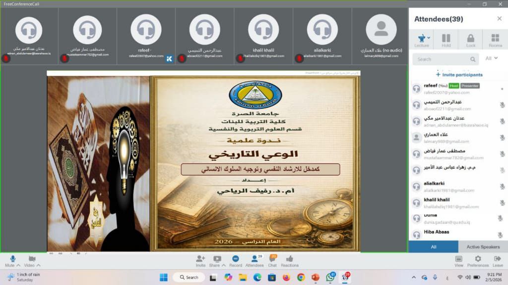 The Center for Development and Continuing Education at the University of Basrah, in collaboration with the College of Education for Women, organized an online workshop titled “Historical Awareness as an Approach to Psychological Counseling and Human Behavior Guidance.”