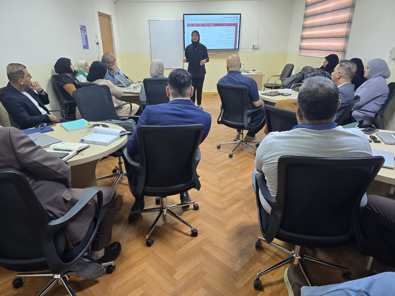 The lecture, presented by Dr. Munaf Abdul Kadhim Al-Qattan and Instructor Marwa Musa Atwan Al-Matouq, included a practical application of creating an online classroom on Google Classroom and Moodle, and how to create announcements, assignments, and tests for students participating in the online classroom. Several activities and tasks were also implemented, which will be part of the trainees' evaluation.